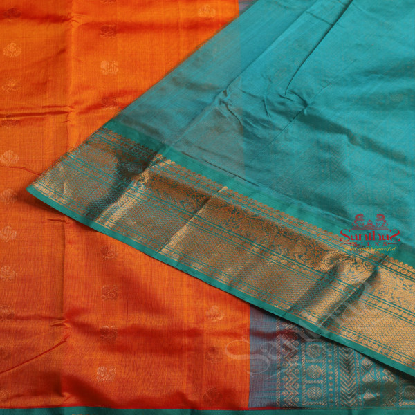 ORANGE YELLOW COLOUR BODY WITH GOLDEN ZARI ANNAM AND LEAF BUTTA WITH CONTRAST BLOUSE & BORDER