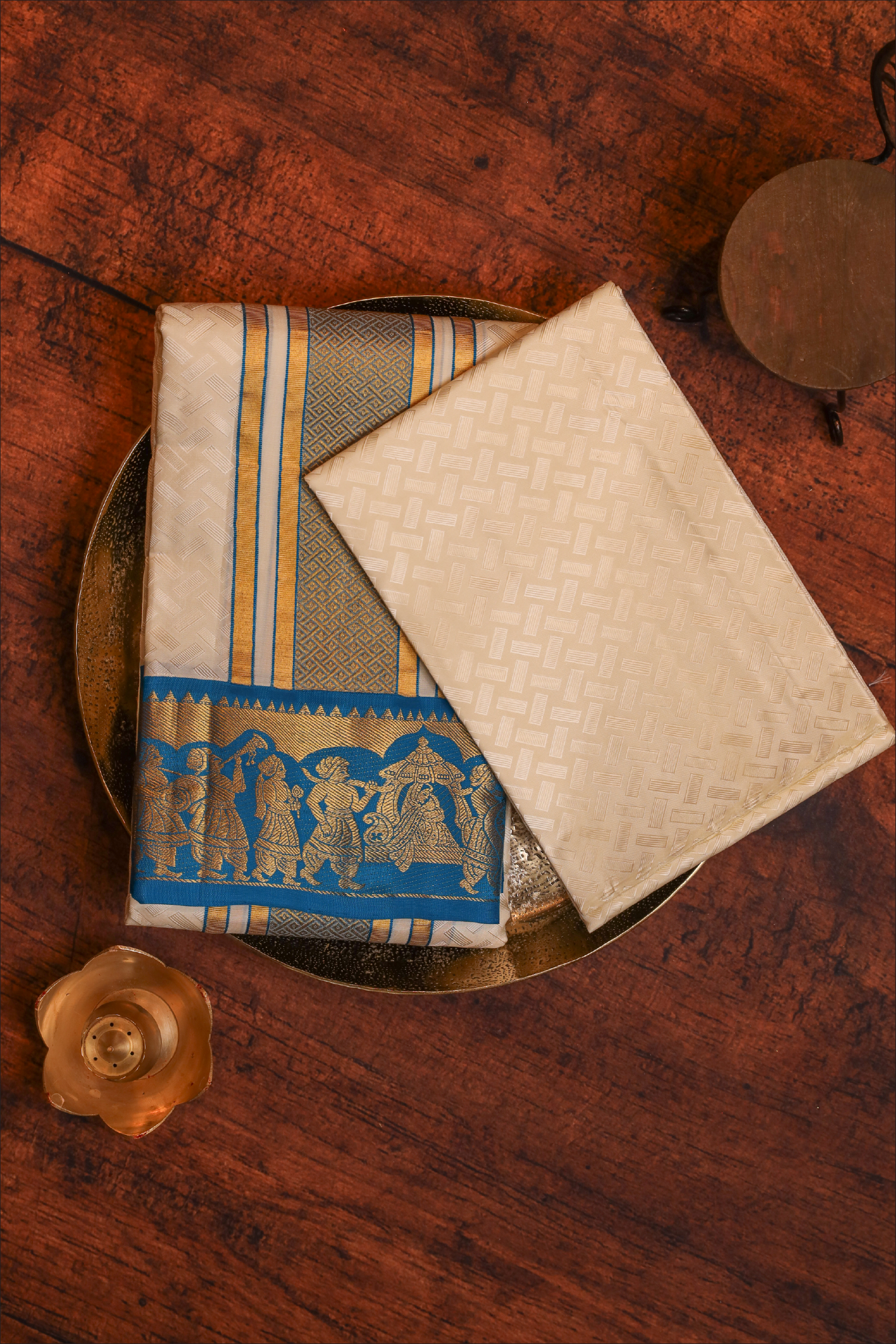 WHITE COLOUR PURE SILK FABRIC SHIRT + DHOTI & TOWEL