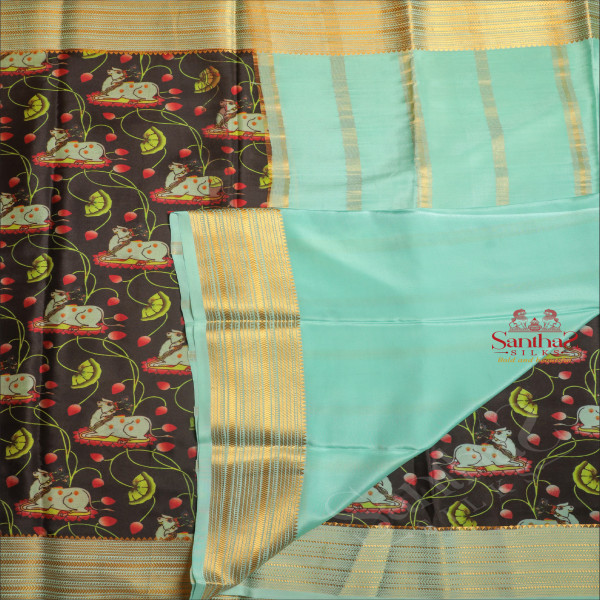 BLACK COLOUR MYSORE SILK SAREE WITH PICHWAI DIGITAL PRINT WITH CONTRAST BLOUSE & BORDER
