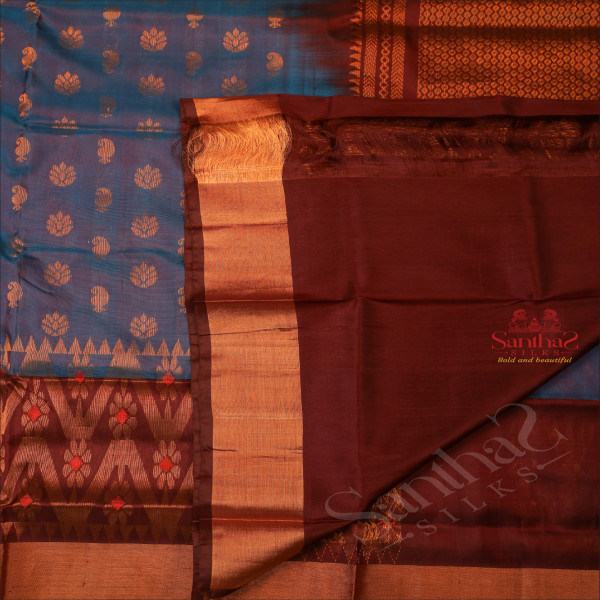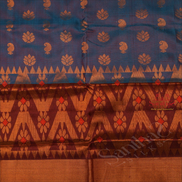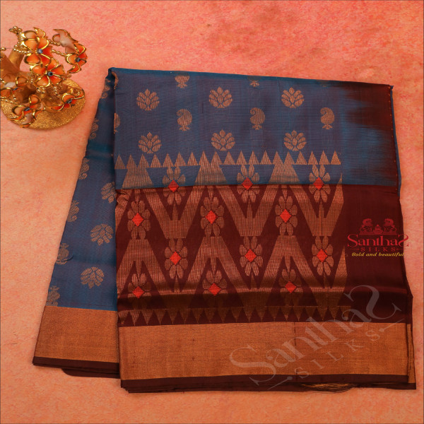 BLUE COLOUR BODY WITH GOLDEN ZARI MANGO FLORAL BUTTA WITH CONTRAST BLOUSE & BORDER