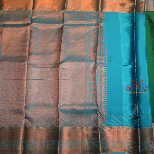 DARK GREEN COLOUR BODY WITH JACQUARD FLORAL EMBOSED IN COPPER ZARI WITH CONTRAST BLOUSE & BLUE BORDER