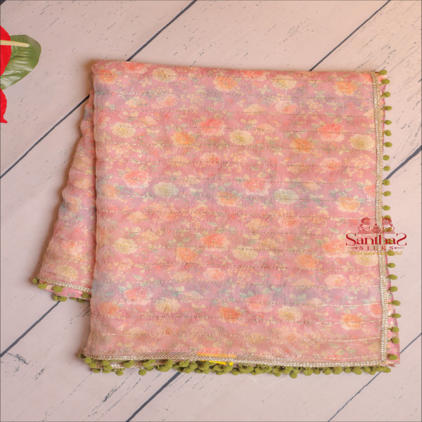 BABY PINK COLOUR FANCY WORK SAREE WITH STRIPS AND CONTRAST BLOUSE
