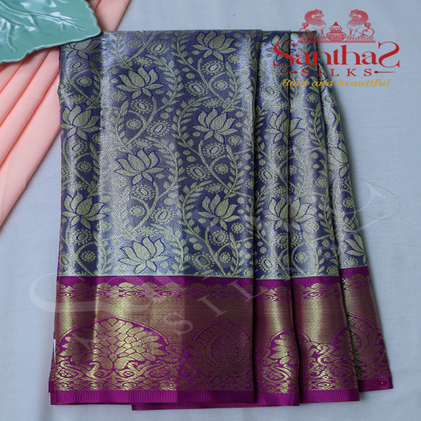 SILVER TISSUE PATTU PAVADAI WITH CONTRAST PINK BLOUSE & BORDER
