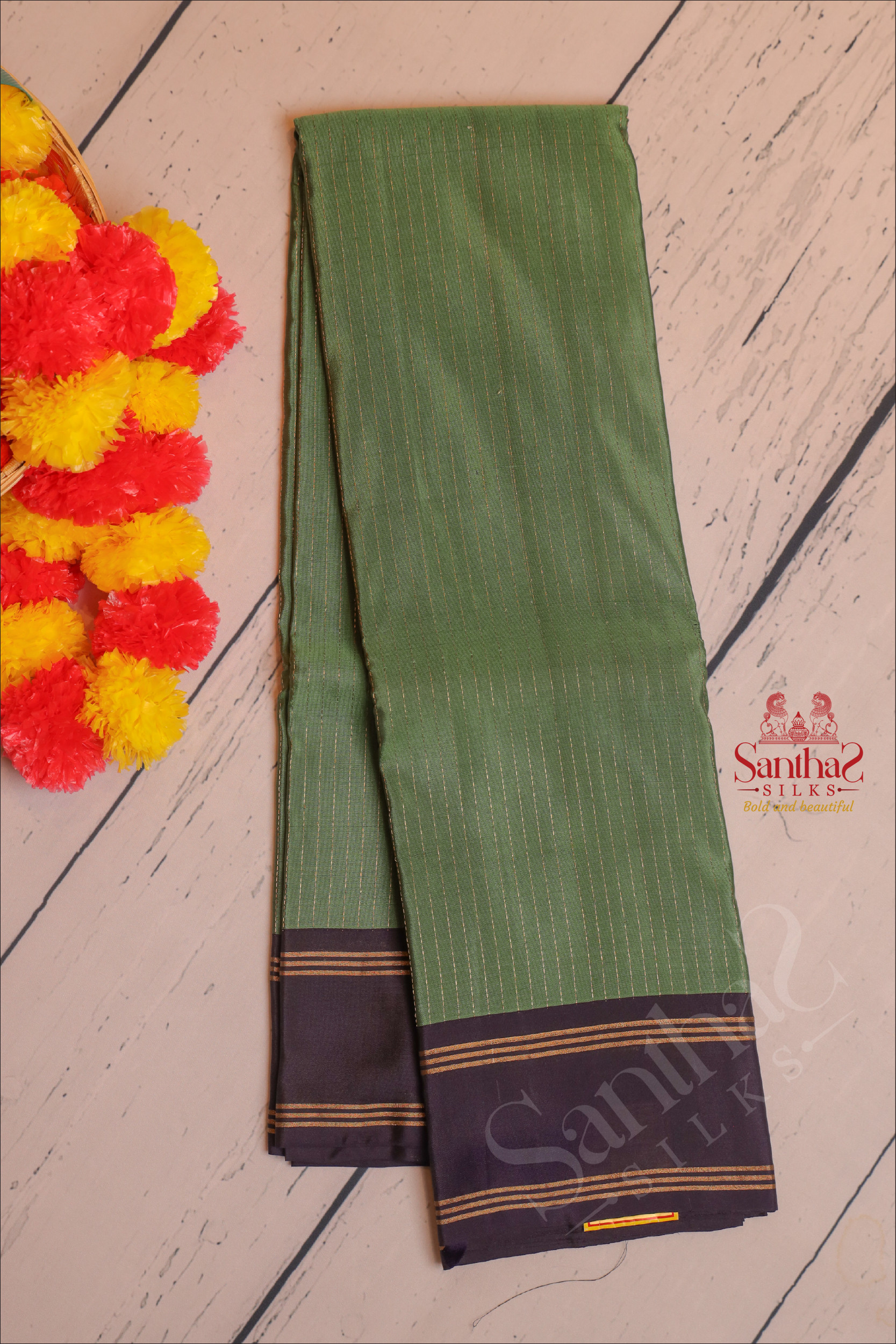 OLIVE GREEN COLOUR BODY WITH GOLDEN ZARI STRIPS WITH CONTRAST BLOUSE & BORDER