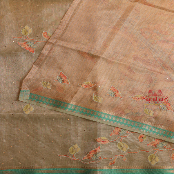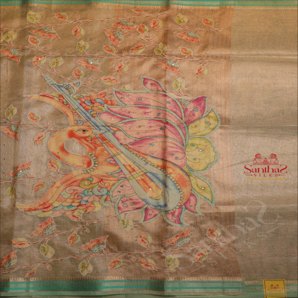 KOTA TISSUE SAREE WITH CRANE & FLORAL APPLICK WORK IN GREEN COLOUR