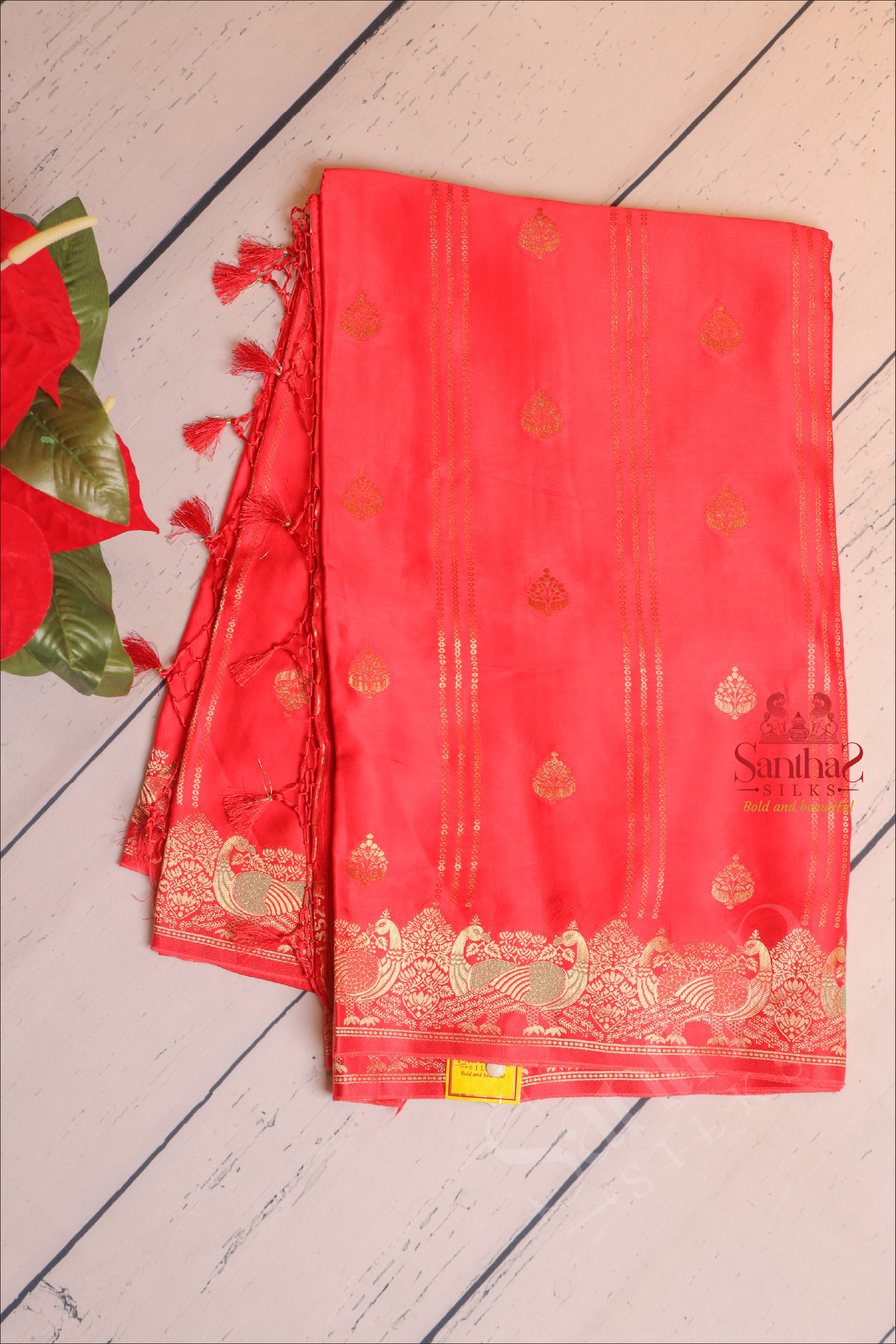 RED COLOUR SATIN BANARAS SAREE WITH ZARI FLORAL BUTTA AND SELF BLOUSE