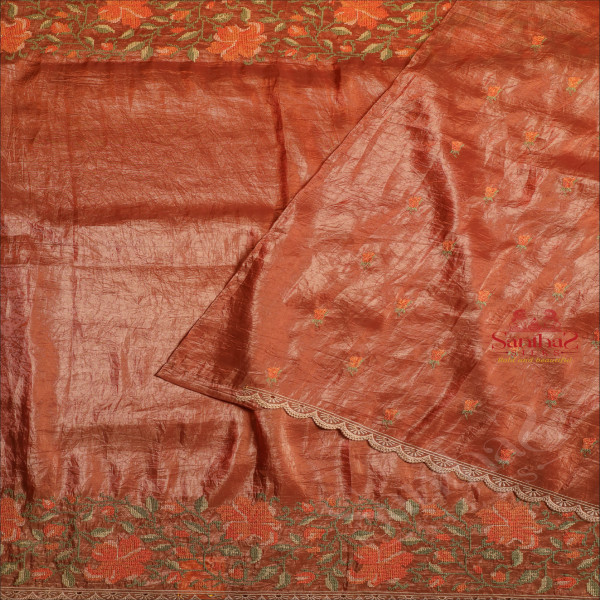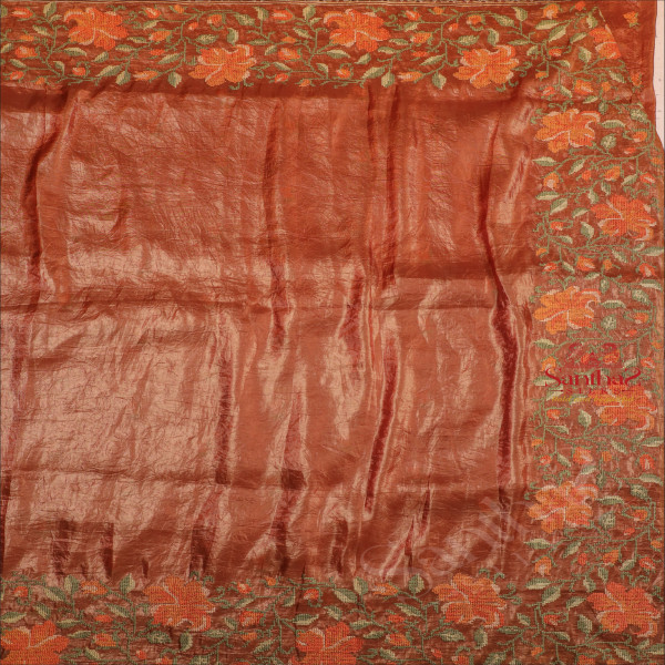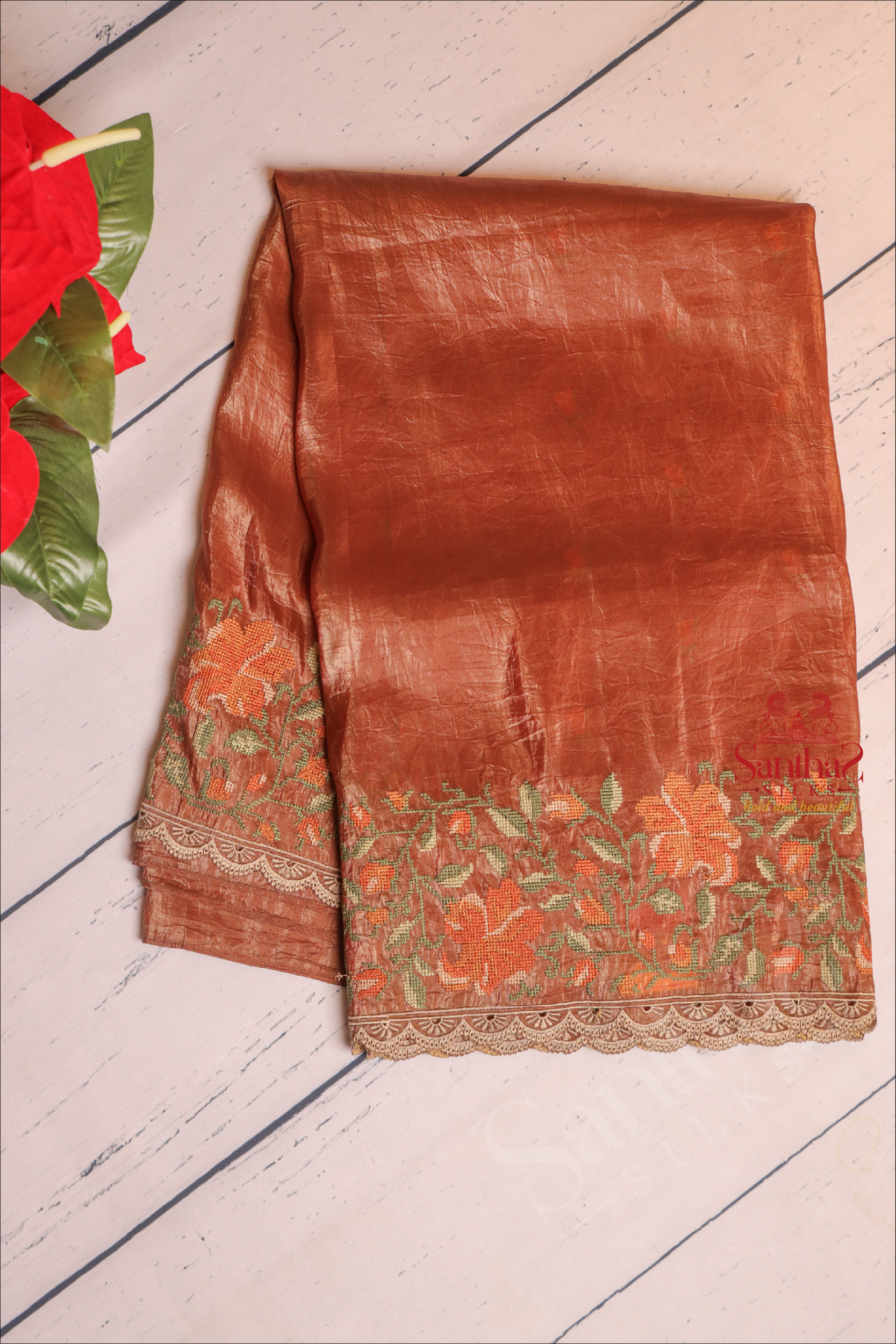 CHOCOLATE BROWN COLOUR CRUSH TISSUE SAREE WITH FLORAL DESIGN AND SELF BLOUSE