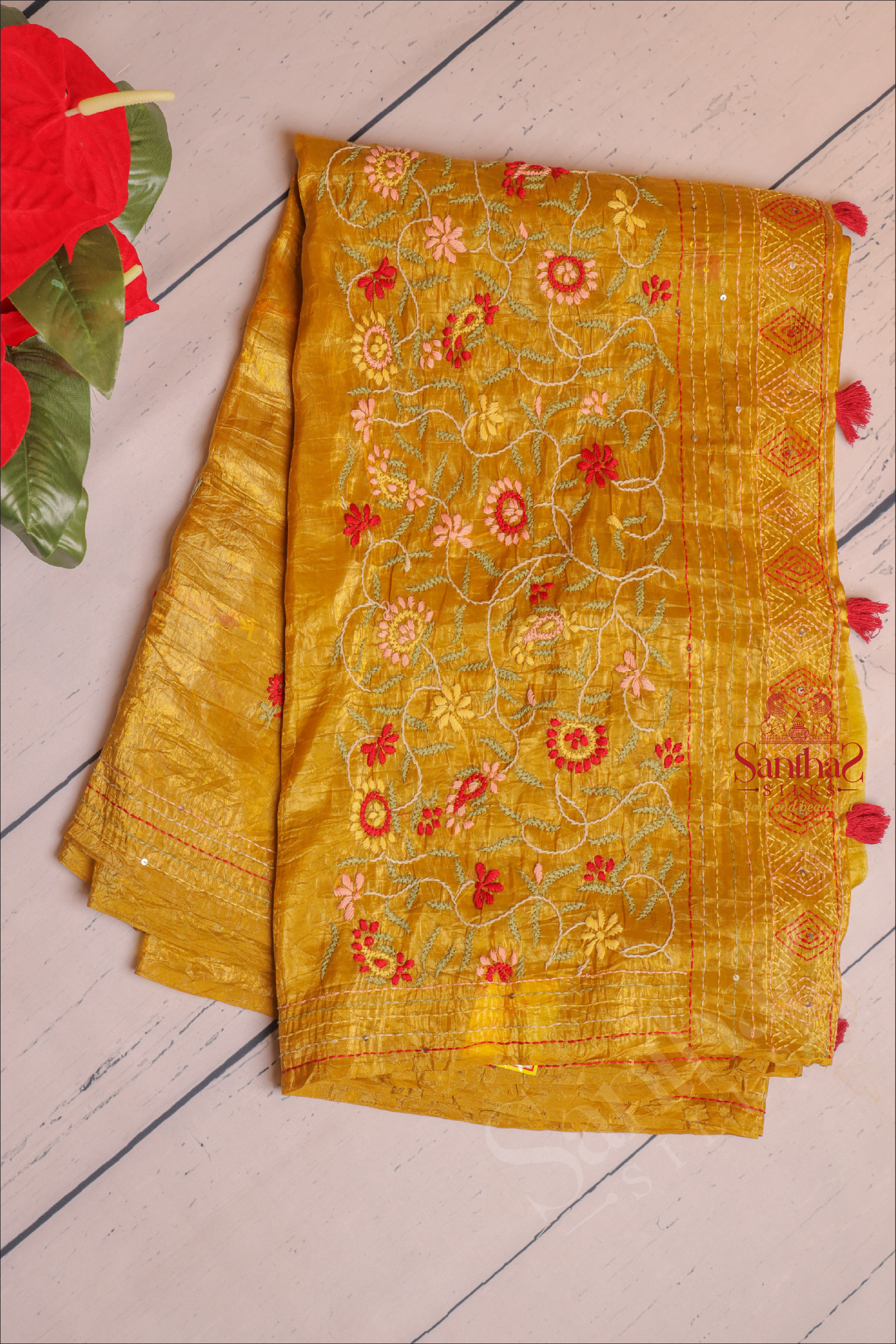 MEHENDHI GREEN COLOUR CRUSH TISSUE SAREE WITH FLORAL EMBROIDERY DESIGN WITH SELF BLOUSE