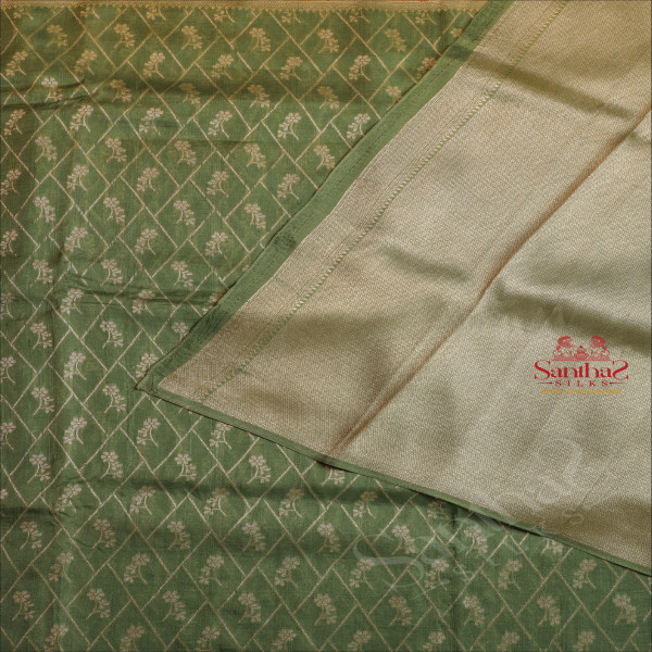 SEMI BANARAS SAREE IN MIDDLE GREEN WITH FLORAL & DIAMOND SHAPE WEAVING DESIGN