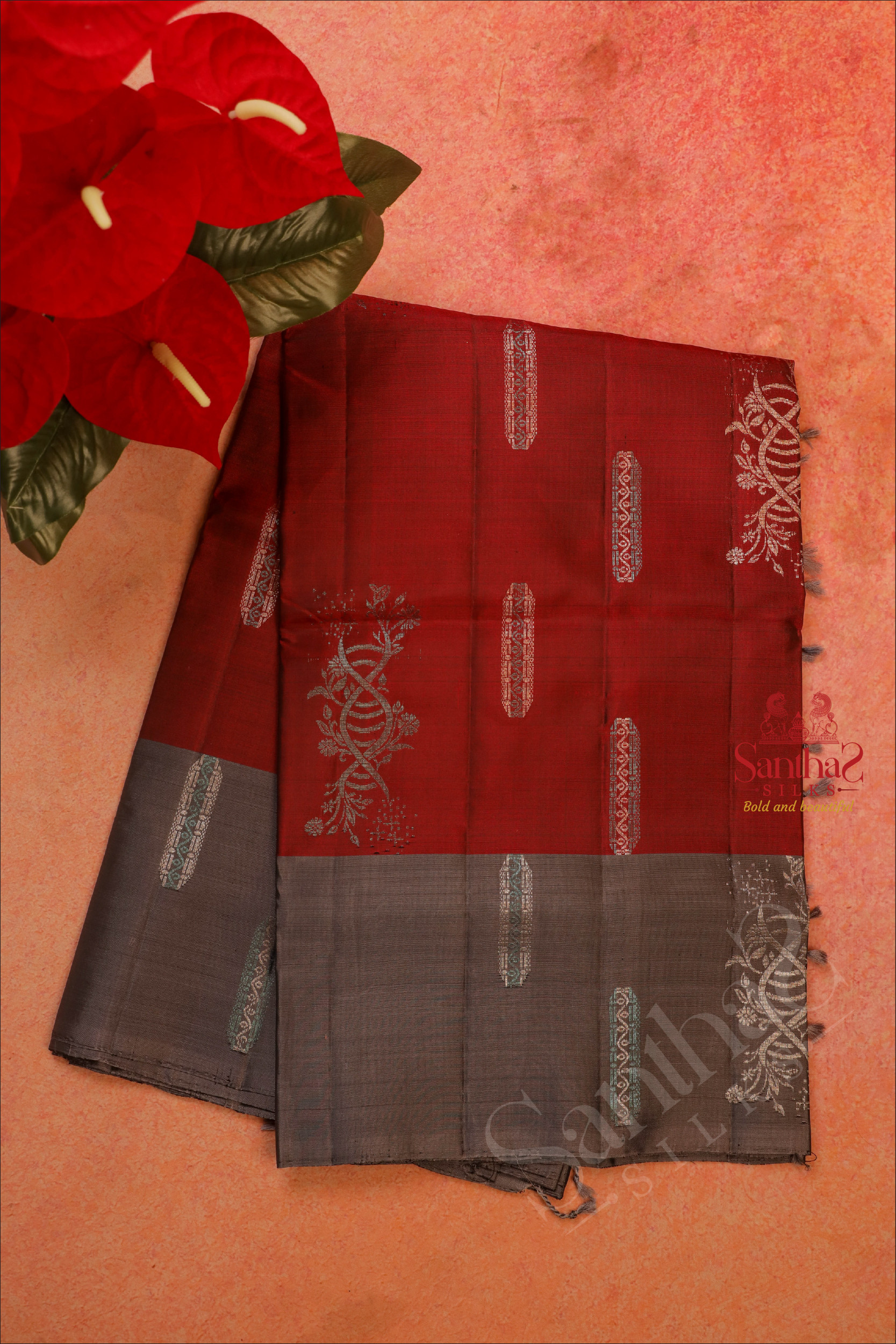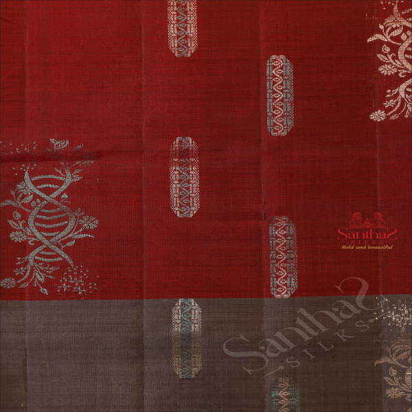 MAROON COLOUR BODY WITH SILVER ZARI FLORAL BUTTA WITH CONTRAST BLOUSE & BORDER