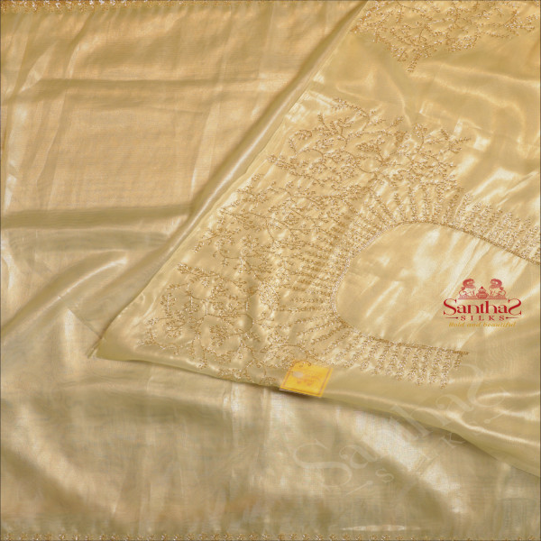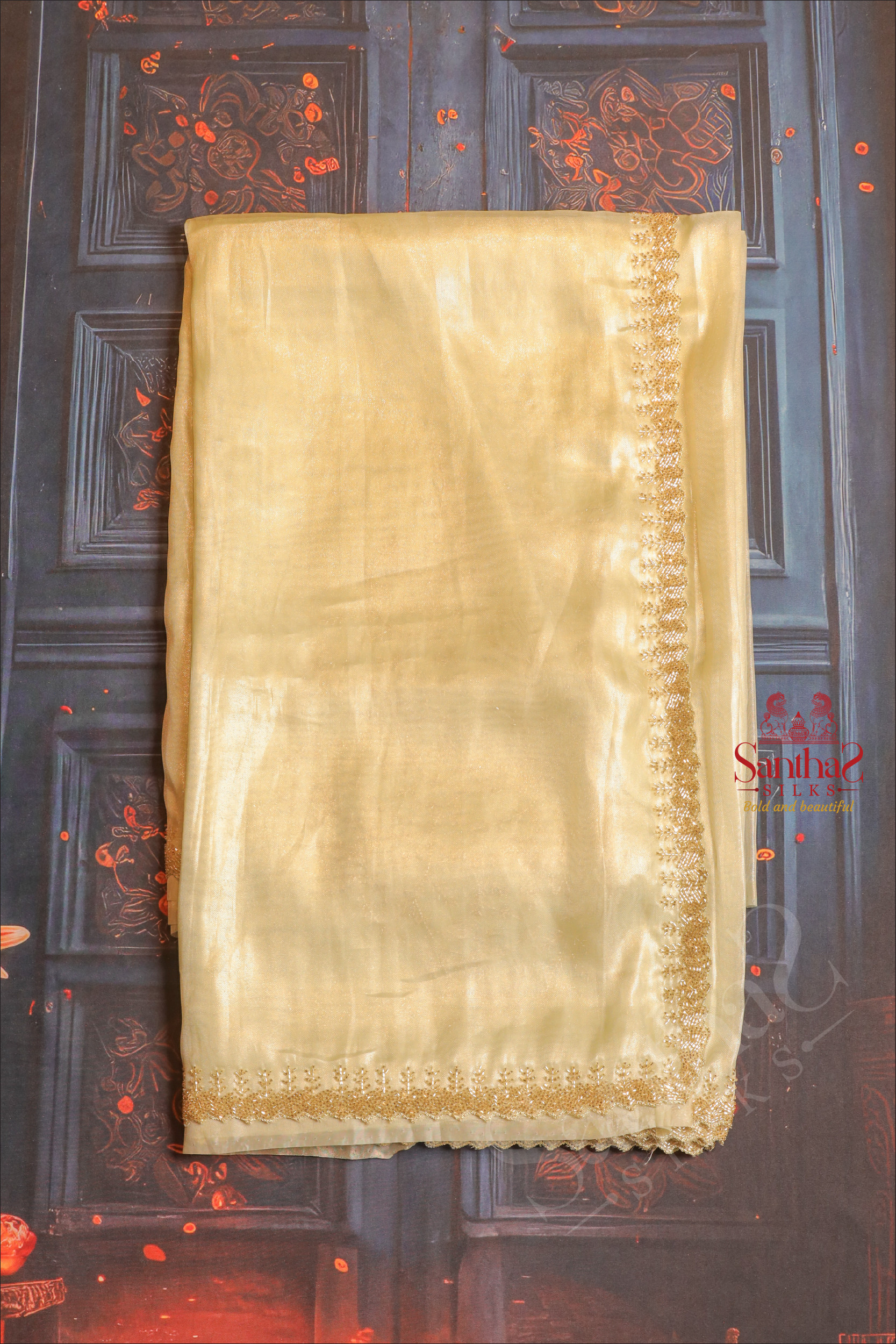 PISTACHIO GREEN COLOUR ORGANZA TISSUE SAREE WITH FANCY WORK BORDER AND SELF BLOUSE