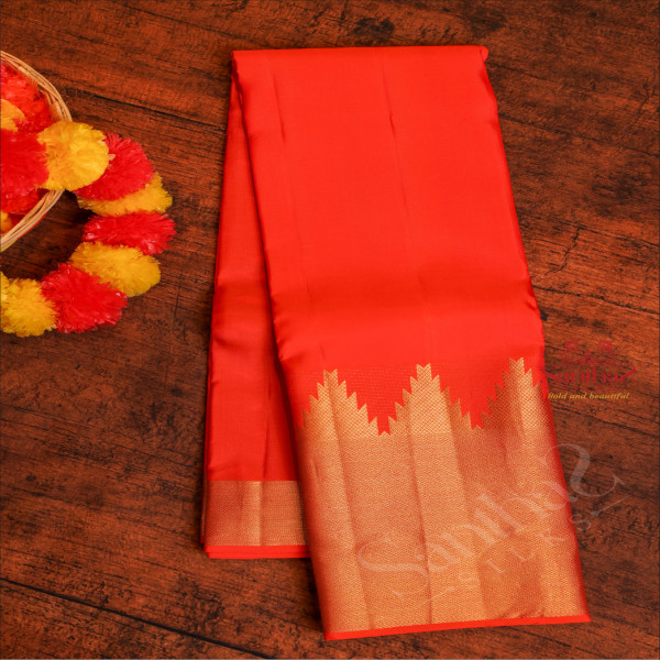 ORANGE COLOUR BODY WITH LONG BORDER IN TEMPLE DESIGN AND SELF PALLU & CONTRAST BLOUSE