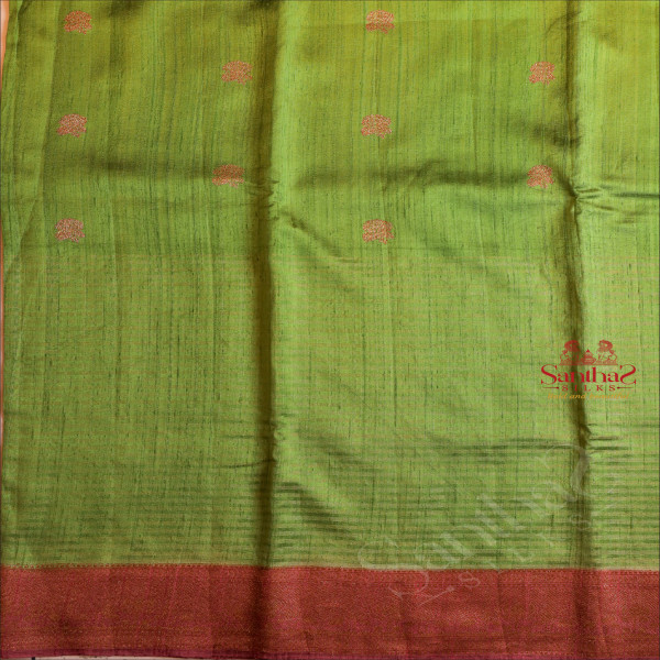 BOTTLE GREEN COLOUR RAW SILK SAREE BODY WITH GOLDEN & SILVER ZARI STRIPS & BUTTAS AND CONTRAST COLOUR PALLU & BLOUSE