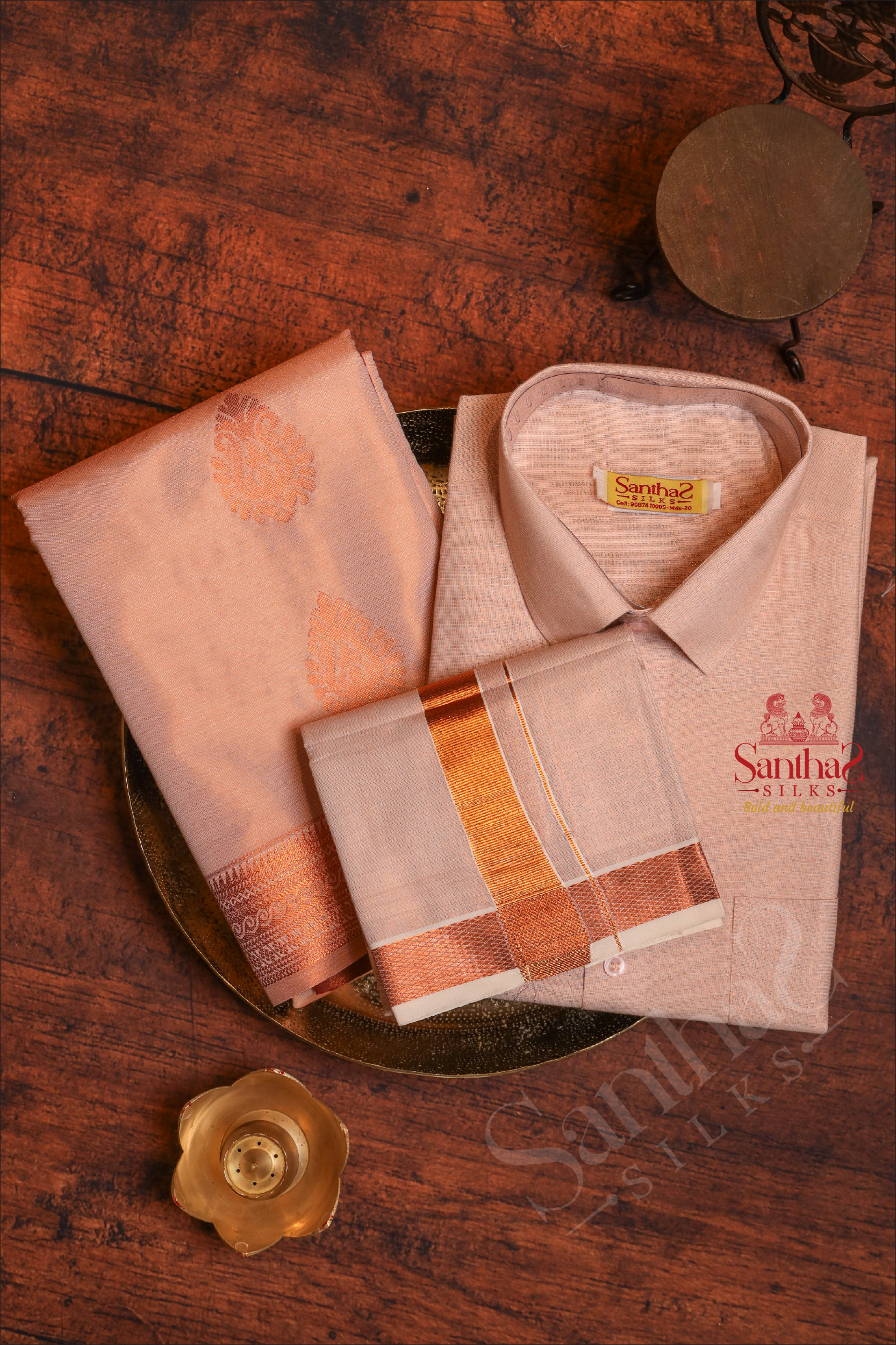 COPPER COLOUR TISSUE SHIRT + 8 YARD DHOTI & SAREE