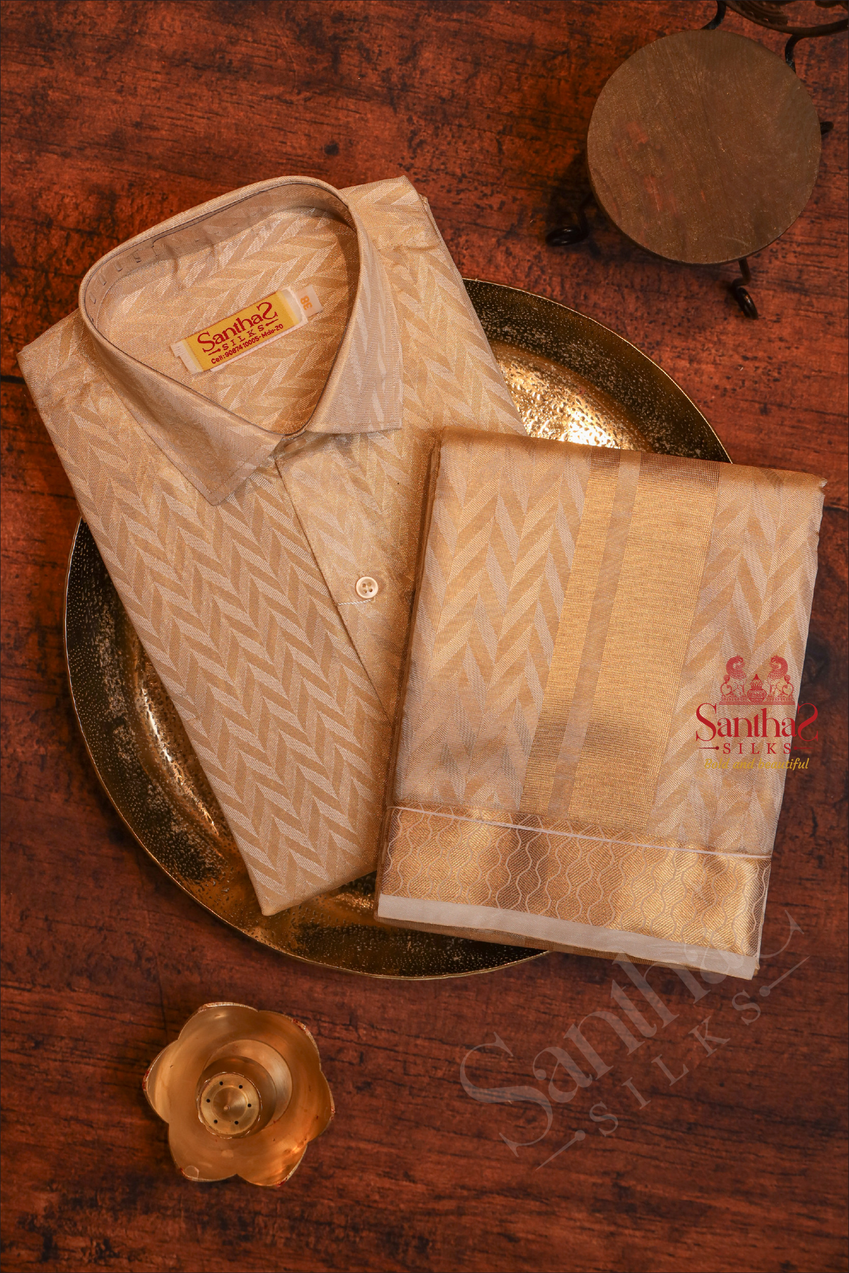 ROSE GOLD COLOUR EMBOSED SHIRT + DHOTI + TOWEL & HANDKERCHIEF WITH PERFUME + BELT